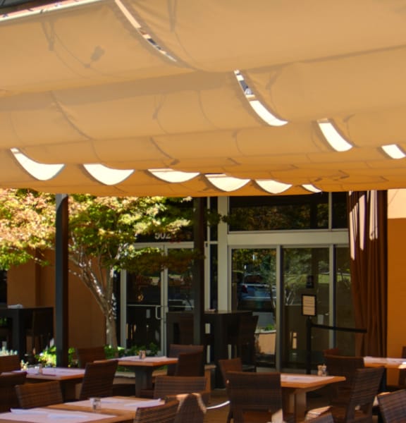 Designed to withstand daily usage, varying sun exposure, and changing weather conditions, slide-wire canopies deliver reliable performance and style for high-use hospitality and retail settings.