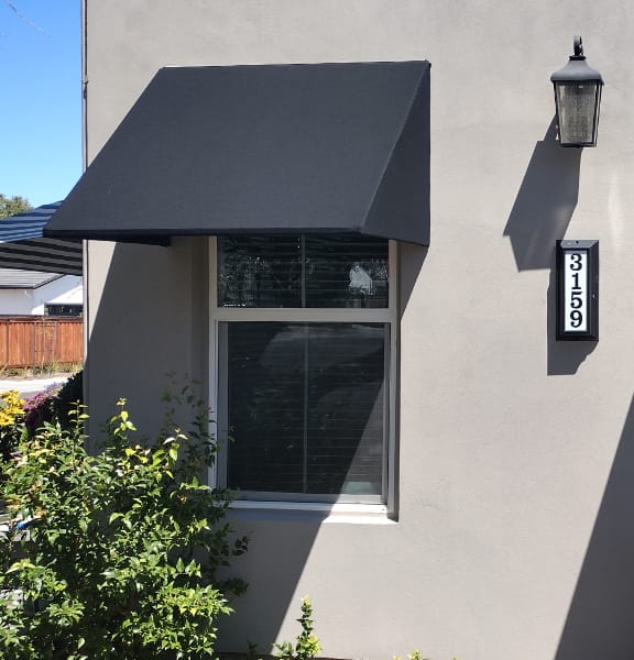 All awnings consist of a sturdy metal frame structure and then depending on the design, the awning’s canopy may be made of durable outdoor fabric or solid metal panels. Fixed awnings attach to the building façade and do not require posts or beams, unlike patio covers which are more like a roof extension supported by posts.