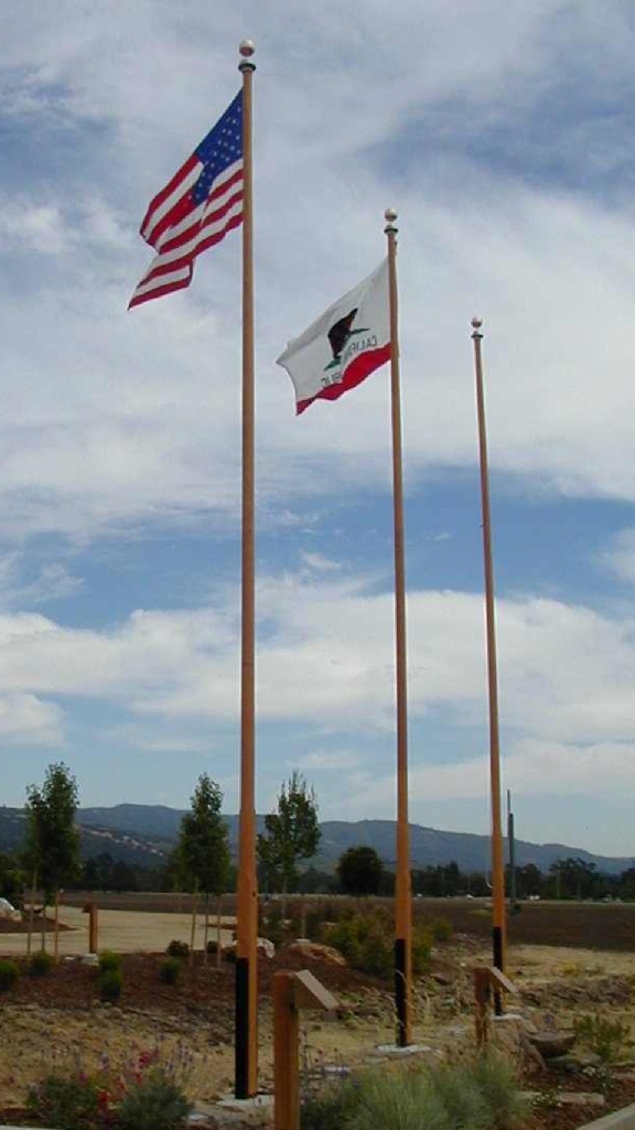 These are the most common commercial flagpoles—a one-piece (or occasionally multi-piece) tapered aluminum or steel pole anchored into a concrete foundation with a ground sleeve. They’re designed to provide strength, stability, and elegance in high-visibility spaces like parks, schools, and civic entrances. Typical heights range from 20 to 50 feet or more, depending on visibility and wind requirements.