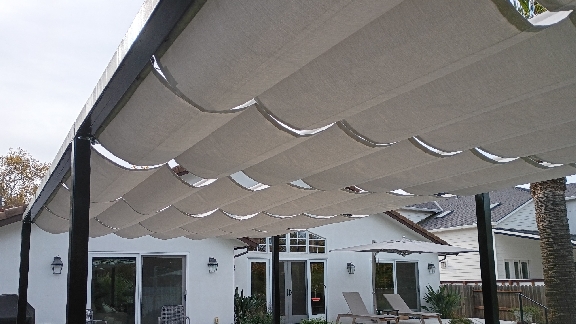 The aesthetic is often compared to a Roman shade for outdoors: the fabric drapes in gentle waves when extended and gathers into neat pleats when retracted (often called a bellows fold). This creates an attractive look whether the canopy is open or closed. You also have the option to combine multiple slide-wire canopy sections side-by-side to shade very large patios or odd-shaped areas.